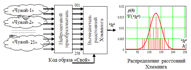 Требования к объему памяти (к числу тестовых образов «Чужой»), а также требования к вычислительным возможностям процессора удается сократить, если при тестировании мы знаем код «Свой». Тогда мы имеем возможность перейти от статистического анализа обычных кодов к анализу статистик расстояний Хэмминга: