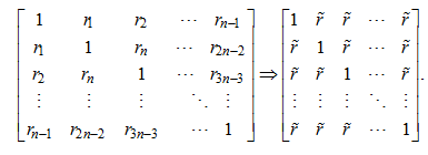 Очевидно, что для каждой из возможных комбинаций разрядов кодов мы можем вычислить матрицу корреляционных связей. Если размерность корреляционной матрицы велика, найти энтропию ее кодовых комбинаций сложно. Однако мы можем упростить задачу, предположив, что матрица корреляционных связей симметрична (все коэффициенты корреляции вне диагонали одинаковы). Для исходной n-мерной асимметричной корреляционной матрицы с совершенно разными и по знаку, и по модулю коэффициентами корреляции [13] необходимо найти эквивалентную симметризованную матрицу
