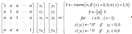 Симметрия эквивалентной корреляционной матрицы удобна тем, что позволяет легко моделировать векторы данных с равной коррелированностью. Для этого достаточно умножить вектор независимых случайных данных на симметризованную связывающую матрицу: