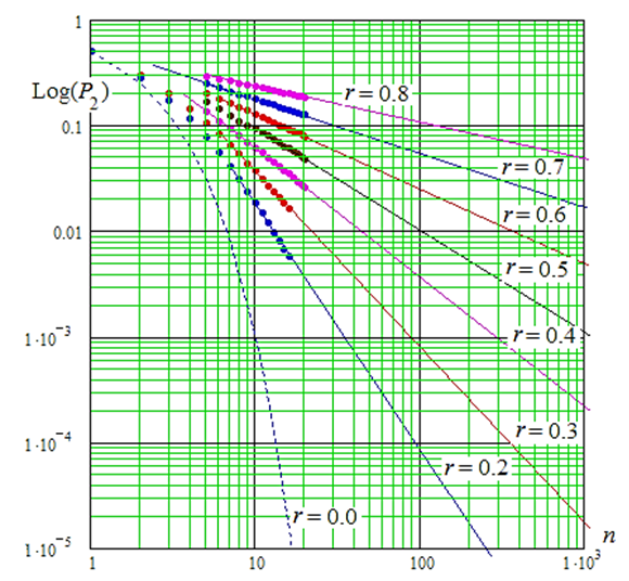 при разных значениях корреляционной связанности разрядов анализируемых кодов P2(n = 1) = 0,5