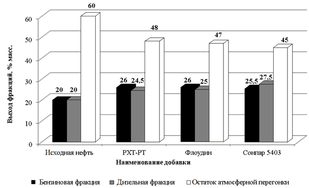 Рис. 1. Результаты атмосферной перегонки нефтяного сырья (концентрация реагентов 10 г/т)