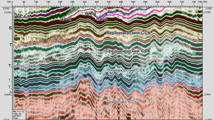 Комплексная геолого-геофизическая интерпретация сейсморазведочной информации выполнена с использованием интерпретационных пакетов GeoFrame (Schlumberger), Petrel (Schlumberger). Был получен большой объем информации, который позволил: детально изучить геологическое строение площади по 18-и отражающим горизонтам осадочного чехла и кровли доюрского основания (рис. 1); выделить и протрассировать тектонические нарушения в пределах выступов фундамента, приуроченных к юрским пластам, при постепенным затуханием их вверх по разрезу.