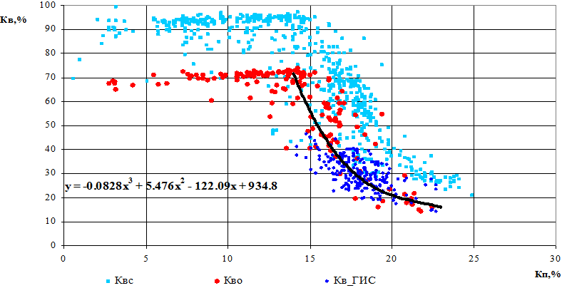 и водонасыщенности по ГИС (точки в центральная части кривой с Кв = 14–40 %) с открытой пористостью