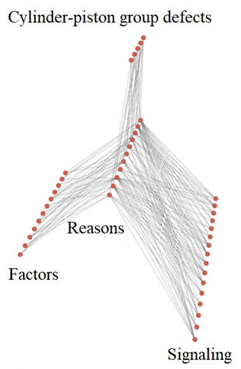 Thus, using the tools of the logic-centred approach involving the graph theory and set theory, it is available to develop a method allowing to estimate (with an acceptable error) the current technical condition of the engine cylinder-piston group (CPG). It should be noted that it is convenient to use graphs in the methodological part, because they make it possible to reflect logically-oriented interconnections between factors, processes and consequences of deviations in the CPG operation (graphs correspond well with the logic-oriented approach) On the other hand, the application of the set theory is conditioned by the polyaspectivity of the considered issue, and a great variety of states of the system elements. To simplify, we can say that the size of the set will be directly correlated with the entropy value. The more entropy a system has, the larger will be the set of its states [1].