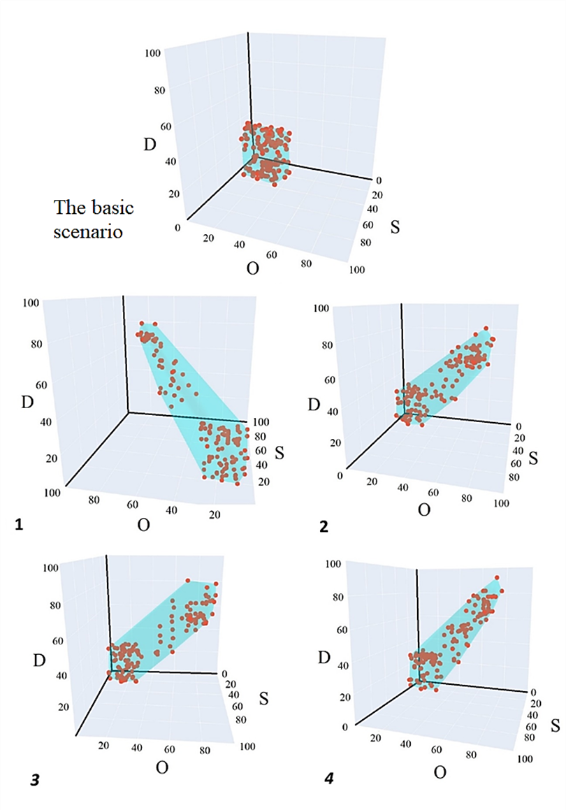We interpret the results obtained in Tables 2-4, as well as their visualization in the form of sets of states of the CPG system of the MAK 6M32S ship diesel engine. It is obvious that the basic scenario in which the cylinder-piston group is after the process of running-in is conditioned by minimally expressed entropy. However, at this stage there are practically no prerequisites for severe failures, the probability of their occurrence is extremely low, and the system is in the most controlled state. Consequently, the base scenario has the smallest weights of graph edges, average value, spread and it forms a compact set of states – all its points are contained in the cube 20 × 20 × 20. The entropy is minimal in the system.