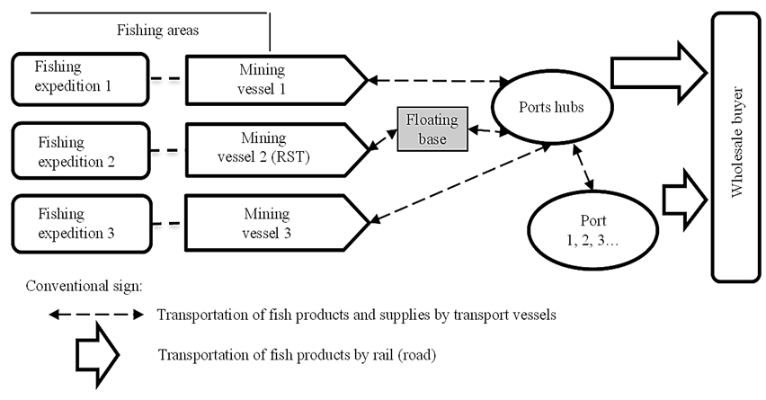 The structure of the traditional fish product distribution system “fishing area – fishing fleet – transport fleet – fishing ports – railway (automobile) transport – wholesale buyers” is shown in Fig. 1.
