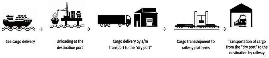 4) the dry port organizes cargo transshipment from the vehicle to the railway platform and then the cargo is sent to the destination (Fig.1).