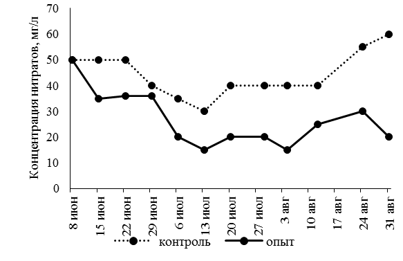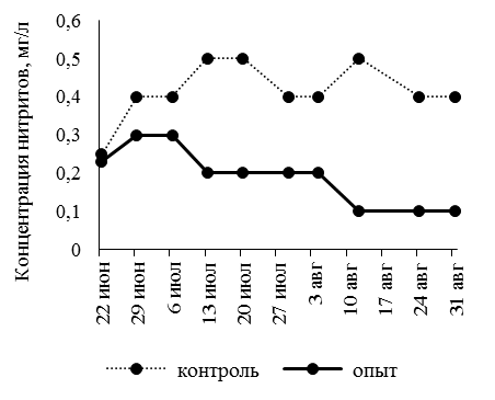 Содержание растворенного в воде кислорода не опускалось ниже 6,5 мг/л, что соответствует нормативным показателям для рыбоводных хозяйств. Активная реакция среды (pH) в основном была нейтральной, иногда смещаясь в щелочную сторону. Проведенные наблюдения за динамикой содержания нитритов, нитратов, аммония свидетельствуют о том, что их концентрация в аквапонной установке была ниже, чем в рыбоводных емкостях (рис. 1).