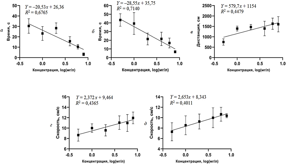 Рис. 2. Линейно-регрессионный анализ показателей локомоторной активности Danio rerio,