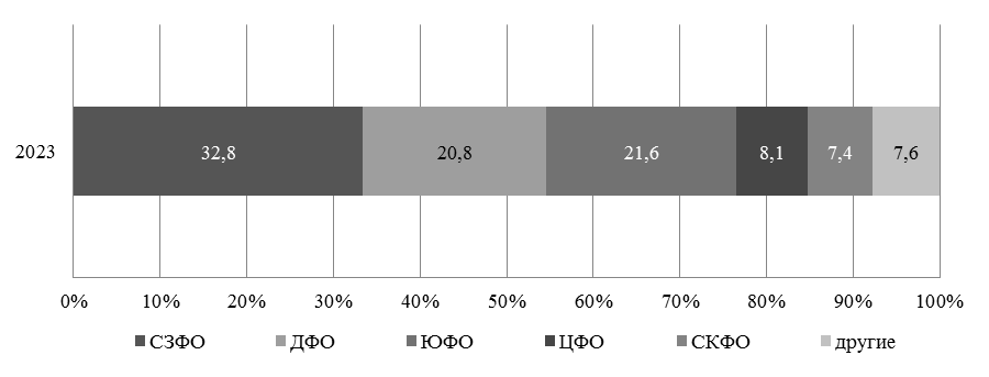 В данном секторе ключевым регионом выступает Северо-Западный федеральный округ (139,1 тыс. т в 2023 г.), специализирующийся на выращивании лососевых и обеспечивающий третью часть всего объема товарного производства аквакультуры России (рис. 3).
