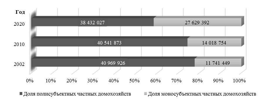 Рис. 2. Соотношение домашних хозяйств, состоящих из одного и нескольких лиц,