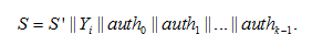 3. Вычислить аутентификационный путь, который необходим для верификации сгенерированной подписи. Аутентификационный путь состоит из k узлов сгенерированного дерева Меркла. Эти узлы выбираются таким образом, чтобы при наличии только лишь выбранного значения a0,i и аутентификационного пути было возможно вычислить значение ak,0. Для каждого целого n от 0 до k – 1 значение, которое является частью аутентификационного пути, определяется как