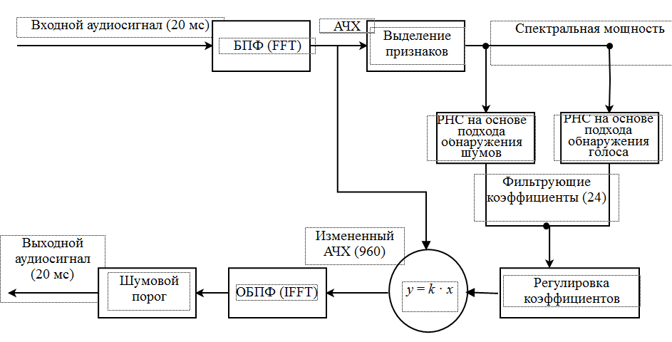 Классические методы решения данной проблемы показывают низкую эффективность в условиях их применения в режиме реального времени, поскольку процесс шумоподавления осложняется необходимостью обработки сигнала с минимальной задержкой без возможности полноценного анализа спектра входящего аудиосигнала. В режиме реального времени допустимы задержки только в несколько десятков миллисекунд, за которые необходимо проводить анализ и обработку аудиосигнала.