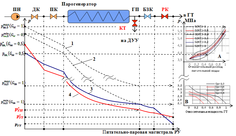 На рис. 1 приведена графоаналитическая модель изменений давлений на характерных участках питательной магистрали при различных положениях КТ, ПК и РК, т. е. мощности главной турбины (ГТ) или главного турбогенератора. Питательная вода подается питательным насосом (ПН) в парогенераторы. При этом основные падения давления происходят на дроссельном клапане (ДК) и ПК. При варьировании расходом питательной воды перепад давления на ПК обеспечивается системой автоматического регулирования и поддерживается постоянным при помощи регулятора перепада давления астатического (РПД-А), а формируемый наклон статической характеристики турбопитательной установки обеспечивается за счет изменения перепада давления на ДК при помощи регулятора перепада давления статического (РПД-С) при варьировании расходом питательной воды. Для этого при каждом новом положении ПК по сигналу от РПД-С изменяются суммарный перепад давления на ПК и ДК, подача пара на турбопривод ПН и частота вращения ПН [10]. Одновременно изменяются проходное сечение ПК и расход питательной воды в парогенераторы. В зависимости от подачи питательной воды в парогенераторы суммарный общий перепад давлений на ПК и ДК находится в пределах 0,6–1,3 МПа (проект 10521) и 0,3–1,6 МПа на ПК (проект 22220).