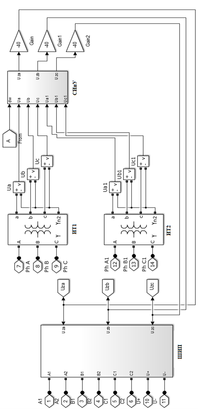 На рис. 4 приведена модель системы управления и измерения с ШИП. В отличие от одноканальной системы управления [9], схема имеет два измерительных трансформатора (ИТ1, ИТ2), с которых поступает информация в систему измерения и управления (СИ и У). В блоке СИ и У входные сигналы суммируются, а на выходе формируется общий сигнал управления ШИП.