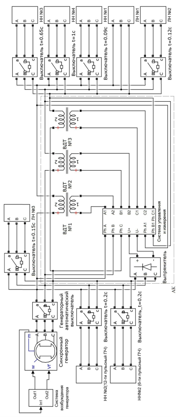 Модель состоит из силовой части, реализованной на эквивалентном генераторе; ЛН, включаемой после запуска генератора; ЛН, включаемых в заданный момент времени с помощью выключателей; НН, подключаемых в заданный момент времени; АК.