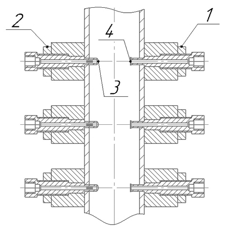 Fig. 6. Installation diagram of the analyzer in the oil pipeline: 1 – analyzer fitting; 2 – sleeve; 3 – straight boss; 4 – radiation source