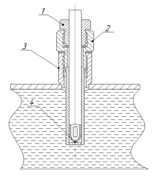 Рис. 6. Схема установки анализатора в нефтепроводе: 1 – штуцер анализатора; 2 – гильза; 3 – бобышка прямая; 4 – источник излучения