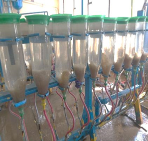 При осеменении использовали 10 мл спермы на каждый 1 кг икринок, перемешивая их в течение минуты с помощью тонкого пера. После промывки икринок использовали разбавленный сок ананаса для окончательного обесклеивания, выдерживая их в этом растворе в течение 20 мин с добавлением разбавленного экстракта зеленого чая для укрепления оболочки икры (рис. 2 а, б). Набухшую икру закладывали в аппараты порциями по 150 г (рис. 2, в).