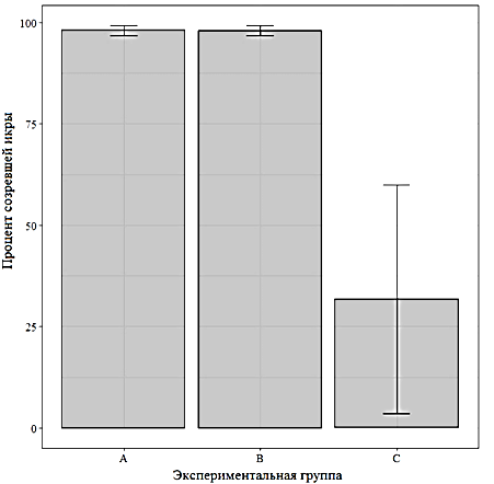 По результатам дисперсионного анализа можно увидеть, что для всех показателей – доли cозревшей икры, процента оплодотворения и вылупившихся личинок – группа C значимо (p < 0,05) отличается от групп A и B, тогда как различий средневыборочных значений между группами A и B не выявлено: в рассчитанный для разности средневыборочных по группам A и B доверительный интервал с надежностью 95 % для каждого из показателей входит нулевое значение, тогда как для разностей средних в группах С – А, C – B доверительный интервал с аналогичной надежностью нулевого значения не покрывает.