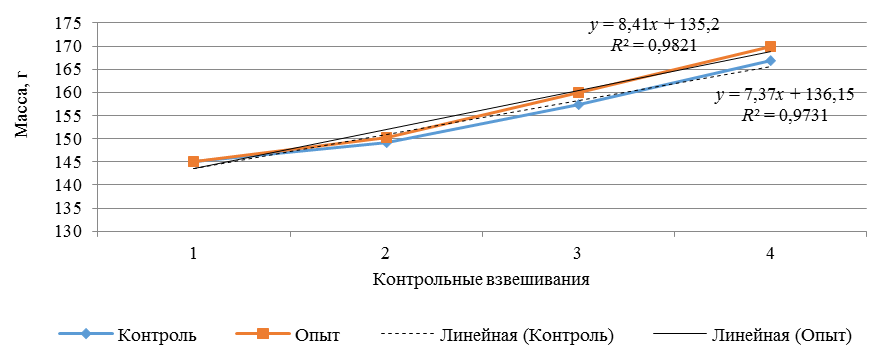 Рыбоводно-биологические и гематологические показатели являются адекватным показателем качества и сбалансированности потребляемого корма. Оценка эффективности частичной замены рыбной муки на муку из личинок мухи черной львинки показала, что лучшие показатели роста были отмечены в опытной группе рыб, где абсолютный прирост, среднесуточный прирост, среднесуточная скорость роста и коэффициент накопления массы были выше, чем в контроле (табл. 2, рис.).
