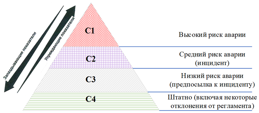 Подобная классификация событий приводится в Руководстве по безопасности «Методические рекомендации по классификации аварийно опасных происшествий на опасных производственных объектах нефтегазового комплекса» [5], однако данная классификация не учитывает 4-й уровень при рассмотрении пирамиды событий.
