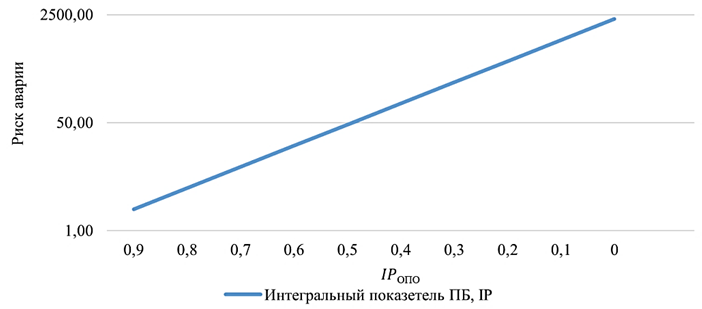Используя расчетные формулы надежности ГОСТ Р 51901.14-2007 [8], интегральный показатель состояния ПБ ОПО IPОПО является произведением всех блоков, входящих в систему, т. е. вычисляется на основе общего интегрального показателя состояния элементов ОПО IPОПО эл, показателя результативности АПК ОПО IPОПО АПК и общего интегрального показателя состояния ПБ смежных ОПО IPОПО см:
