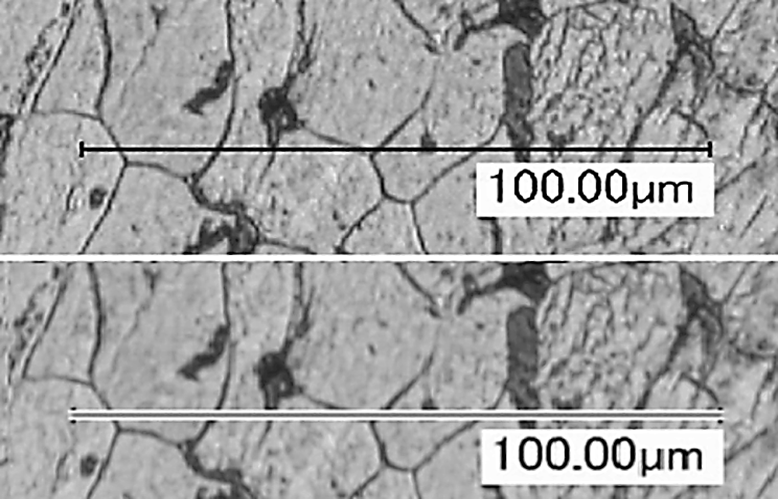 На изображении микроструктуры при помощи метода распознавания Хафа ищется масштабная линия. Далее для демонстрации работоспособности данного метода и для верификации найденная линия выделяется белым цветом. Следующим этапом по формуле вычисляется размер пикселя. Найденная длина пикселя в дальнейшем интегрируется в алгоритм расчета размера зерен.