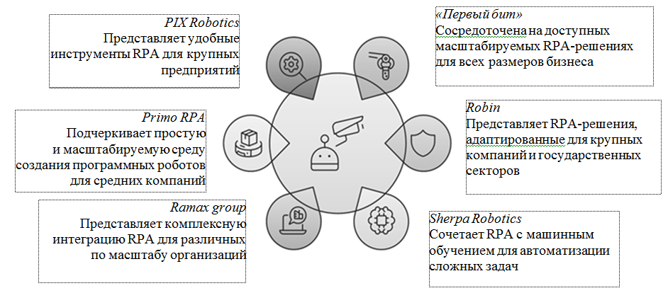 mation) демонстрирует темпы роста около 20–30 % в год. Основной спрос на роботизацию исходит из таких секторов, как банковская деятельность, телекоммуникации, ритейл и государственные структуры. Ключевыми российскими компаниями в области RPA являются PIX Robotics, Robin, Primo RPA, «Первый бит», Ramax group, Sherpa Robotics