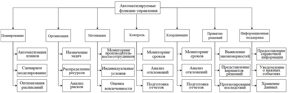 Интеграция умного помощника в структуру управления не вызывает изменения сути управленческого влияния во всех приведенных структурах управления, т. к. умный помощник используется в качестве инструмента доведения управленческой функции и не является самостоятельным отдельным руководителем, изменяющим структуру управления. На рис. 2 определен перечень основных автоматизируемых функций управления.