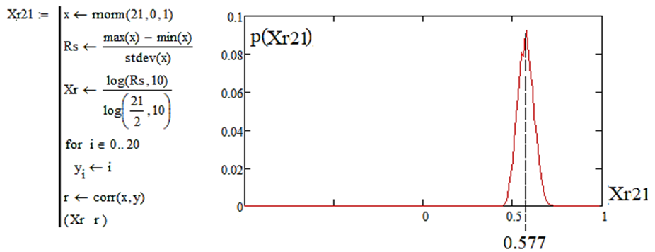 В левой части рис. 2 приведена программа, моделирующая данные показателя Хёрста на языке программирования MathCAD для малых выборок в 21 опыт с нормальным распределением, нулевым математическим ожиданием и единичным стандартным отклонением. В правой части рис. 2 приведено распределение значений показателя Хёрста. Из этого распределения следует, что его математическое ожидание составляет значение 0,577. Это существенно больше того, что предсказывает теория. Появляется существенная методическая ошибка порядка 15,4 %. Ее необходимо компенсировать, как это показано в формуле (1), тогда положение меняется и математическое ожидание распределения данных точно совпадает с теоретическим, как это отображено на рис. 1. Численным моделированием можно показать, что вычисление показателя Хёрста по формуле (1) будет приводить к смещению математического ожидания в сторону его увеличения при любом росте модуля корреляционной сцепленности [12]. Само значение показателя корреляционной сцепленности данных в нашем случае совпадает с вычислением коэффициента корреляции по классической формуле Пирсона – Эджуорта – Эдлтона конца XIX в.: