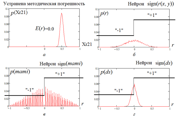 Критерий знака регрессии (2) является дискретным, распределение амплитуд вероятностей его значений приведено на рис. 3, в. Очевидно, что этот, как и предыдущий, критерий коэффициентов корреляции, может быть преобразован в формальный бинарный нейрон sign(mami), откликающийся состоянием «–1» и «+1». К сожалению, как и предыдущий формальный нейрон, этот новый нейрон работает с высокой вероятностью ошибок первого и второго рода P1 = P2 = 0,5. Тем не менее два этих нейрона уже могут использоваться в паре, т. к. отклики их базовых критериев слабо коррелированны: corr(r, mami) ≈ 0,31.