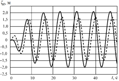 Однако необходимо учитывать, что это изменение происходит только на длине погруженной в воду носовой оконечности и на протяжении относительно небольшой доли периода качки. Поэтому итоговое влияние изменения присоединенных масс при зарывании носовой оконечности в волну на исследуемые параметры оказывается не столь существенным, как это будет показано ниже при рассмотрении конкретного примера.