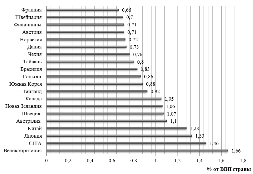 Статистические данные свидетельствуют о том, что на рекламу в настоящее время приходится примерно 1 % мирового ВВП, хотя эта цифра значительно варьируется в зависимости от страны. Например, в Великобритании наблюдается один из самых высоких относительных уровней расходов на рекламу (1,66 % от общего ВВП страны). В США расходы на рекламу составляют почти 1,5 % ВВП. В Японии и Китае также наблюдаются относительно высокие темпы инвестиций (рис. 3). При этом расходы на рекламу, например в Пакистане, составляют всего 0,18 % ВВП. В Саудовской Аравии и Турции этот показатель также ниже четверти процента [6]. Россия в данном списке стран занимает 41-е место – 0,46 % ВВП страны.
