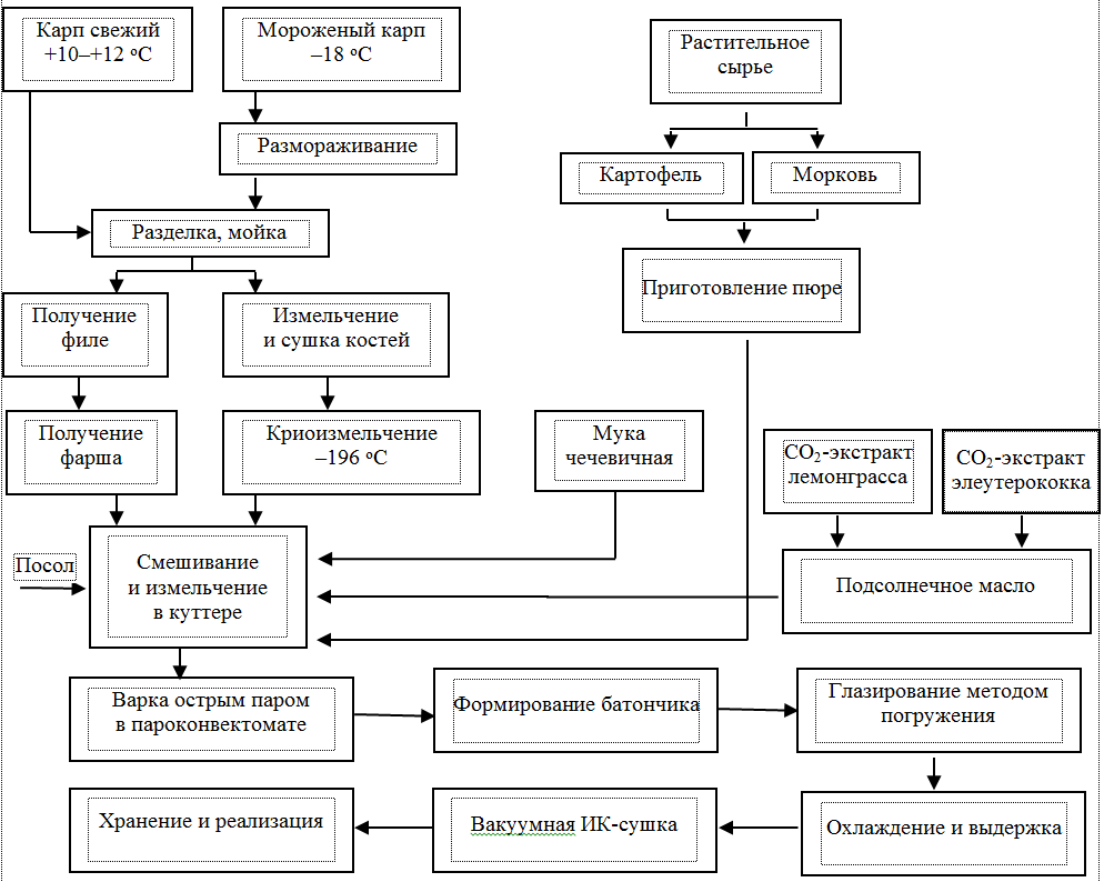 Выполнена оценка актуальности работ, посвященных созданию многокомпонентных продуктов быстрого питания. Разработана оригинальная технология рыборастительного батончика специализированного назначения, обогащенного СО2-экстрактами с антиоксидантными свойствами. Представлена последовательность технологических этапов переработки в фарш мышечной ткани гибрида голого карпа, выращиваемого в рыбколхозе «Шапариевский» Славянского района Краснодарского края. Из овощного сырья объектами исследования выбраны чечевица сорта «Донская краснозерная», картофель сорта «Голубизна» и морковь сорта «Лакомка». В качестве минерального обогатителя использовали криопорошок из костей карпа. Впервые в рецептурный состав рыборастительных продуктов включены СО2-экстракты лемонграсса и элеутерококка, что позволило повысить антиоксидантные свойства готового продукта. Исследован химический состав карпа голого, карпа чешуйчатого, картофеля, моркови, чечевицы, СО2-экстрактов лемонграсса и элеутерококка. Разработана структурная схема и рецептуры рыборастительных батончиков.