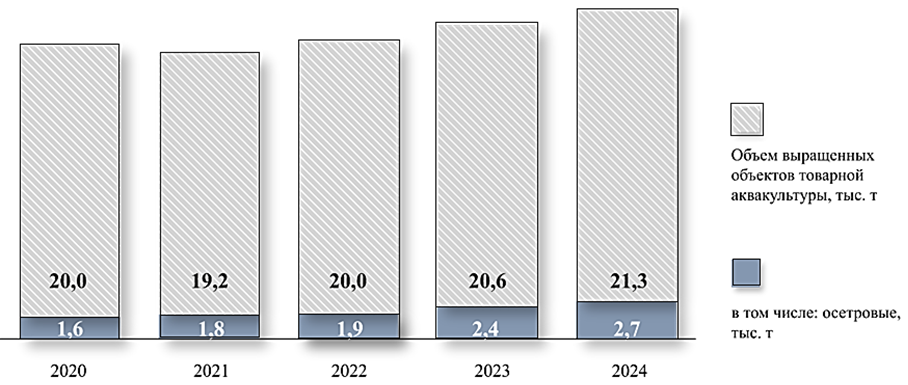 Объемы производства (выращивания) продукции товарной аквакультуры по всем видам рыб (в том числе осетровым) за период 2020–2024 гг. по Астраханской области представлены в табл. 1.