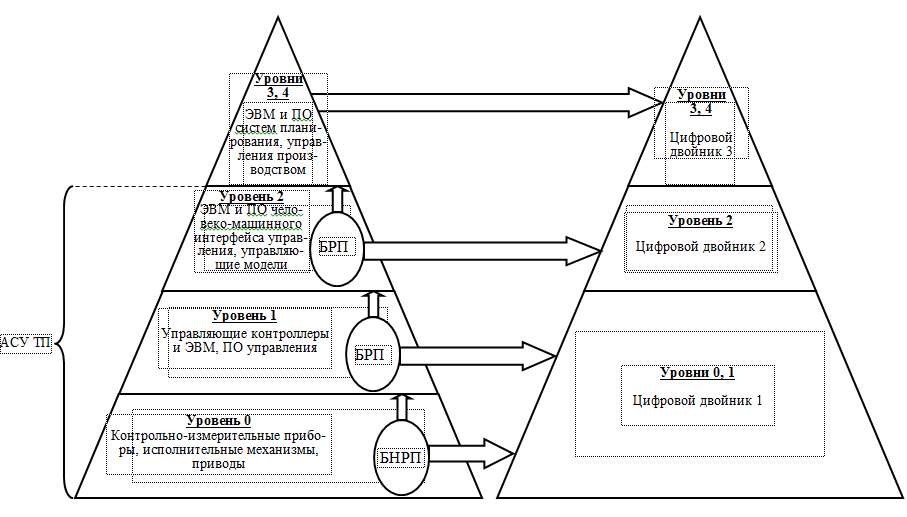 Целью настоящего исследования является разработка нового концептуального подхода к модернизации существующих автоматизированных систем управления технологическими процессами (АСУ ТП), находящихся в промышленной эксплуатации, с целью их интеграции в технологию построения цифровых двойников и цифровых фабрик с минимальными затратами вычислительных ресурсов и сокращением объема обрабатываемых данных. Для решения указанной задачи предлагается проведение модификации существующих АСУ ТП последовательно по уровням автоматизации таким образом, чтобы в структурах уровней происходило снижение объема избыточной информации, а также прогнозирование значений технологических параметров на основании свойств объектов управления с применением средств искусственного интеллекта с целью использования идентичных значений и в АСУ ТП, и в моделях их цифровых двойников. Для получения информации о технологических процессах с низкой степенью автоматизации предлагается применение организационно-технических структур, построенных на базе теории графов с конечной вершиной, отражающей объем и качество полученной продукции, с использованием алгоритмов на базе средств искусственного интеллекта, позволяющих на основании результатов предыдущего этапа с учетом накопленного опыта прогнозировать результат последующих, что даст возможность экспертной оценки правильности ведения технологического процесса для достижения требуемых свойств продукции и производительности технологического агрегата. Предлагаемая концепция модификации АСУ ТП, находящихся в эксплуатации, даст возможность обеспечить переход к построению цифровых двойников технологических процессов с минимальными затратами времени с использованием имеющихся вычислительных ресурсов с минимальными потерями количества производимой продукции.