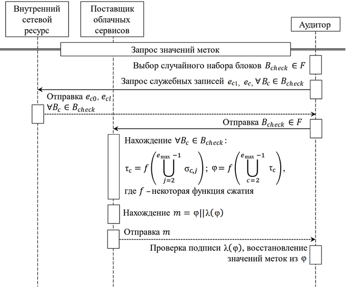 Получив сообщение m, аудитор проверяет подпись и в случае успешной проверки восстанавливает из φ значения меток записей. Для каждого блока
