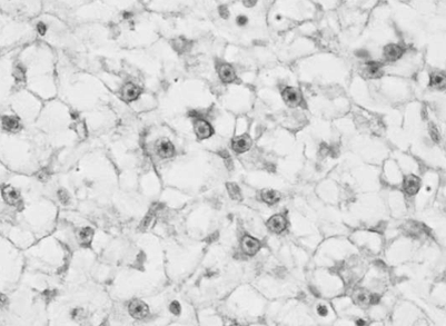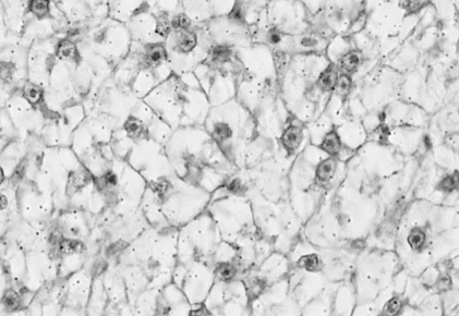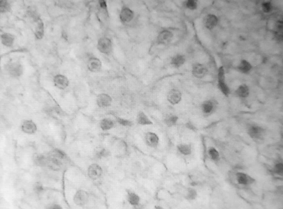 On histological preparations, the nuclei of hepatocytes are clearly visible, having a rounded shape with one clearly distinguishable nucleolus in the middle. The destruction of nuclear structures is not observed.