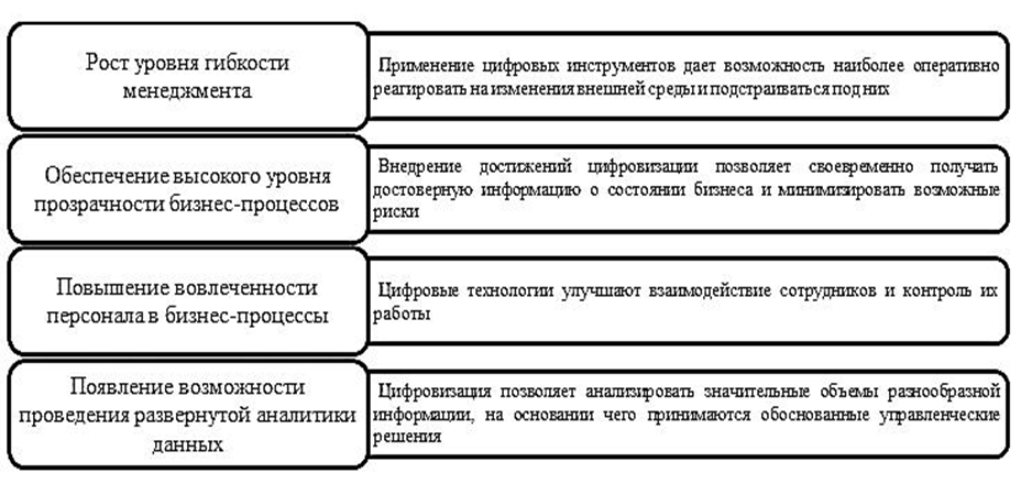 Развитие процессов управления на основании информации в условиях цифровизации современных систем менеджмента способствует формированию у предприятий механизмов быстрой адаптации к условиям внешней среды и их изменениям, что позволяет наиболее оперативно и обоснованно трансформировать модель управления бизнесом в режиме реального времени, а также с учетом его конкретных реальных потребностей.
