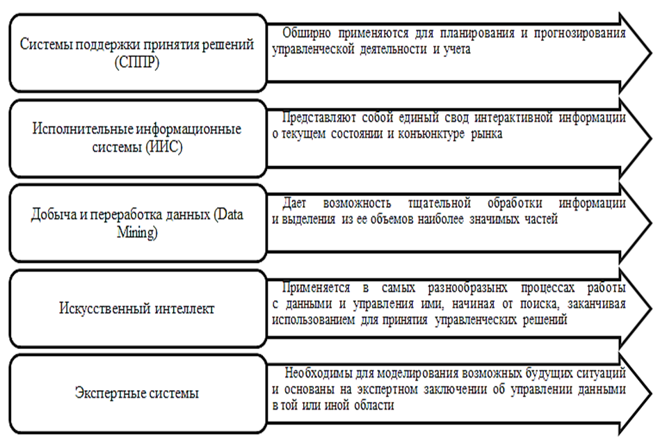 Изучив ключевые особенности и характеристики процессов управления информационными данными в условиях трансформации систем современного менеджмента, необходимо выделить ряд эффективных информационных технологий, применяемых в рамках работы с разнообразными сведениями, а именно [9]: