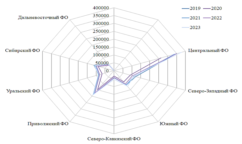 Анализируя данные по общему числу созданных субъектов МСП в разрезе федеральных округов (ФО) России за 2019–2023 гг., можно отметить, что Центральный ФО имеет их наибольшую долю (+32,9 %) к уровню РФ (рис. 1).