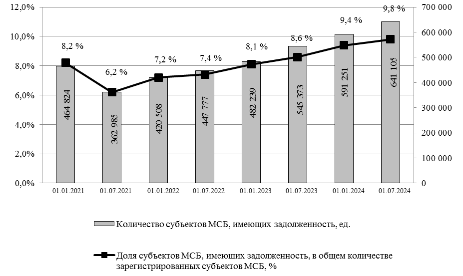 Число субъектов, имеющих задолженность со второй половины 2022 г., увеличивается, и на 01.07.2024 их количество составило 641 105 ед. (рис. 3). Рост данного показателя за период двух лет составил 34,19 %.