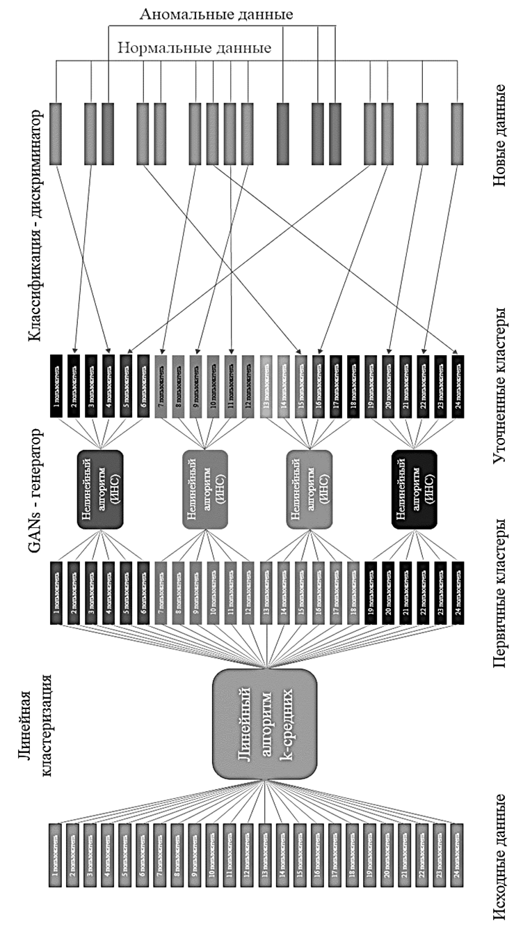 В задачи генератора входит создание новых данных с распределением генеральной совокупности, что позволит сократить время внедрения предлагаемого решения до 1 месяца, в то время как существующие UEBA-системы требуют для сбора данных и обучения от 3 до 6 месяцев непрерывного функционирования. Дискриминаторную модель предлагается использовать в режиме бинарного классификатора, что позволит отделять нормальное поведение пользователя от аномалий. В ходе состязательного обучения генератора и дискриминатора, где генератор будет стремиться создавать максимально правдоподобные примеры поведения пользователя, а дискриминатор находить отличия между исходной и генерируемой совокупностью данных, мы будем стремиться минимизировать ошибки работы дискриминатора. Данный подход отличается от эталонной модели генеративно- состязательных сетей, где минимизируют ошибки генератора исходя из первоначальной задачи этого класса моделей. Также предлагается добавить кластеризацию данных перед обучением генеративно-состязательной сети, это позволит дискриминатору точнее определять аномалии по классу пользователей и заведомо уберет выбросы (пользователей, не похожих на свою группу). Данный способ также отличается от предлагаемых решений UEBA-систем, анализ которых приведен далее, где используются данные из единого пространства пользователей для формирования классов. При таком подходе, в случае наличия в группе легитимного пользователя с повышенными привилегиями, система будет его определять как аномалию по классу, что придется фильтровать вручную. Предлагаемый же подход позволяет автоматизировать данный процесс в целях сокращения времени обнаружения аномальных событий информационной безопасности. Схема работы предлагаемого алгоритма представлена на рис. 1. Обучение модели генеративно-состязательной сети проводилось на выборочной совокупности действий 800 пользователей, собираемых в течение месяца. Признаковое пространство включает несколько основных блоков данных о поведении пользователей: