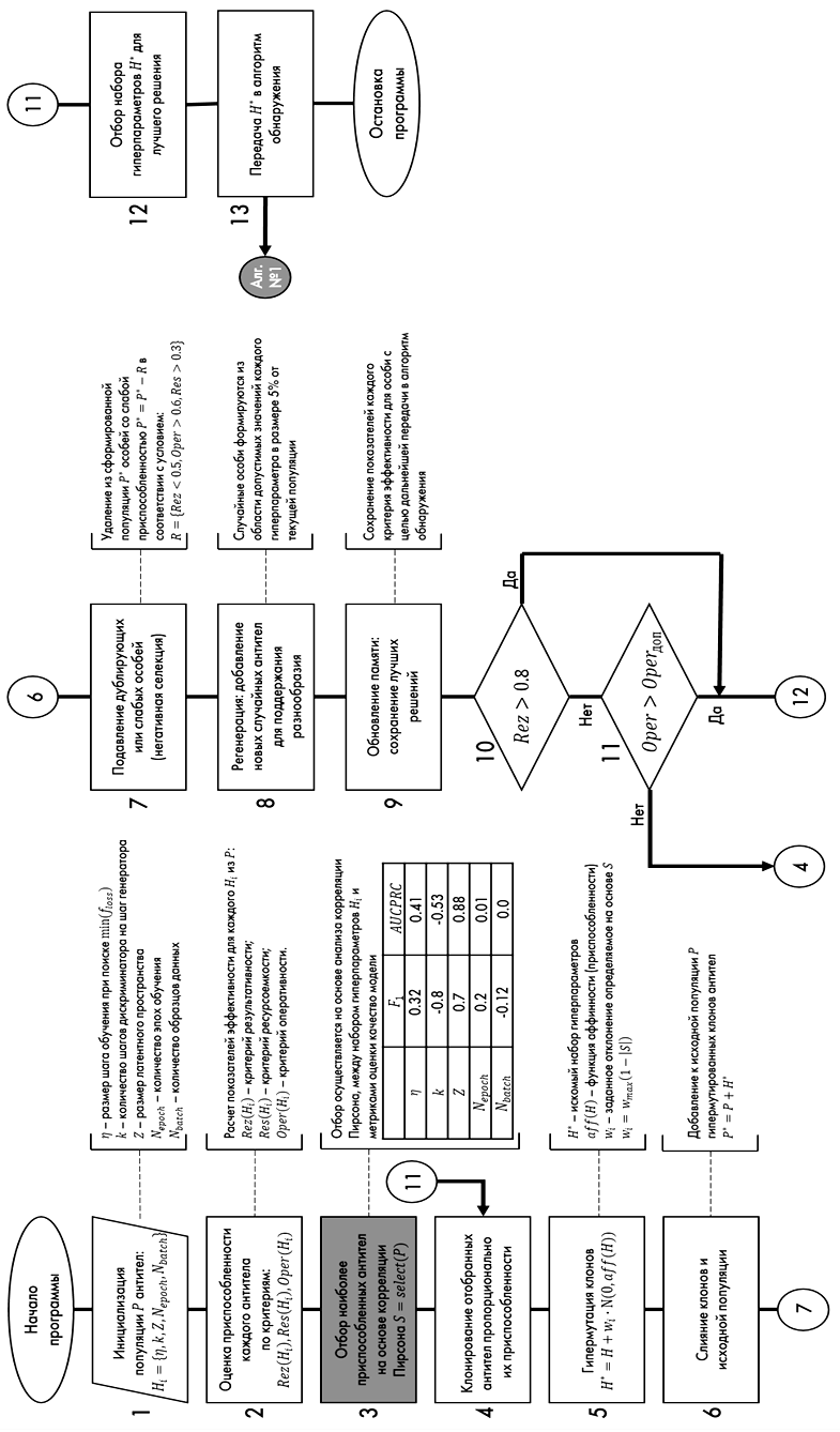 Входными данными алгоритма является набор гиперпараметров, к которым применяется иммунный алгоритм параметрической оптимизации. Выходными данными является матрица оптимальных гиперпараметров, которые передаются в предлагаемый алгоритм обнаружения на основе генеративно-состязательной нейронной сети.