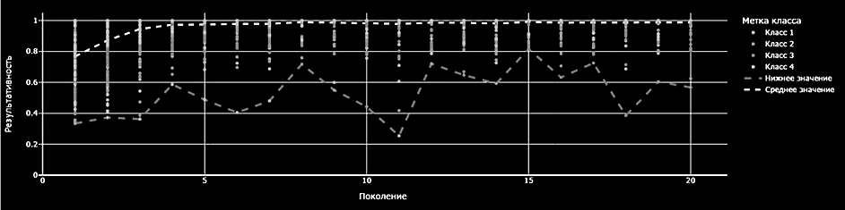На каждом поколении формируется множество особей (наборов гиперпараметров) x, которые мутируют с определенным отклонением N. Область допустимых значений отклонения рассчитывается для каждой особи на основе функции аффинности aff, которая определяет качество модели по метрикам F-меры и roc-auc. Добавленный весовой коэффициент влияет на дисперсию мутации: чем выше вес гиперпараметра, тем меньше он мутирует. Результаты расчета комплексного показателя результативности с учетом весовых коэффициентов значимости представлены на рис. 4.