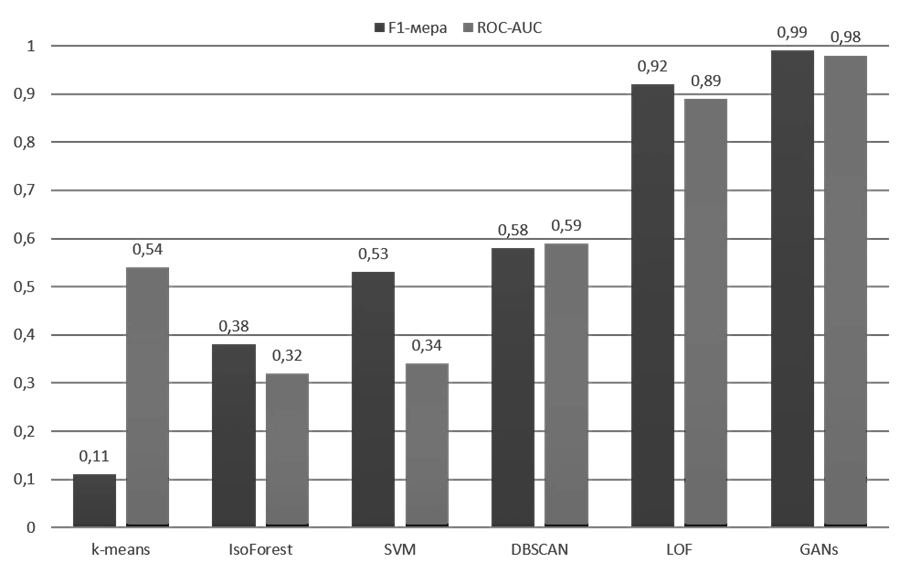 На основе данных, полученных в ходе анализа, было проведено сравнение предлагаемого алгоритма с уже существующими методами на выборочной совокупности исходных данных. Результаты сравнения (рис. 5) показывают, что наилучшие результаты показали алгоритм локальных выбросов (LOF-mod) и предлагаемый в работе алгоритм генеративно-состязательной сети (GANs).