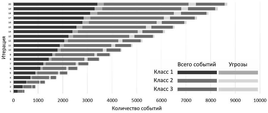 Гистограмма показывает накопление событий по 3 классам на каждом шаге процесса моделирования, а также долю угроз от общего числа событий, которые имитируются в модели. Каждый класс событий отражает группу пользователей, которые анализируются на аномальное поведение. Классы событий определяются путем предварительной кластеризации с использованием алгоритма k-средних. Под угрозами в данном случае понимаются аномальные события, которые отражают поведение внутреннего злоумышленника. На 20-й итерации происходит накопление минимального числа событий моделирования (10 000 событий), из которых 8 725 событий подвергаются анализу, а 1 275 попадают в блок сброса, т. к. не отнесены ни к одному классу событий. Минимальное число событий для моделирования рассчитывалось путем сравнения эмпирического и теоретического распределения с использованием критерия Пирсона.