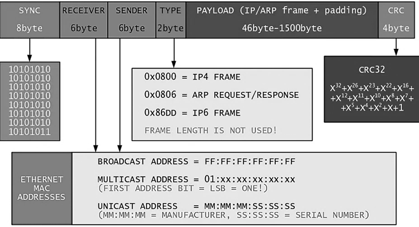 Кадр начинается с преамбулы SYNC длиной 8 байт, поля, содержащего MAC-адрес получателя (RECIEVER), длина которого составляет 6 байт. Этот адрес представляет собой уникальный идентификатор для каждого сетевого интерфейса, что обеспечивает точное адресное назначение в процессе передачи данных. MAC-адреса формируются производителем сетевого оборудования и записываются в микросхему сетевой карты, это гарантирует, что каждый адрес будет уникальным и не будет повторяться среди других устройств в сети. Зная MAC-адрес получателя, отправитель может уверенно передавать информацию, точно определяя, кому она предназначена.