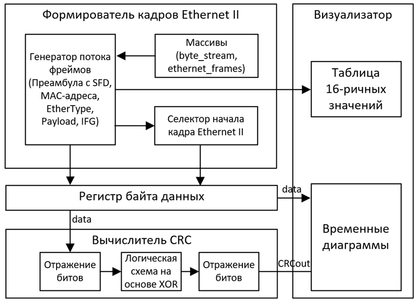 Функциональная схема моделирования кодера (рис. 2) с вычислением CRC32 для кадров Ethernet II состоит из формирователя кадров Ethernet II, вычислителя CRC и визуализатора.